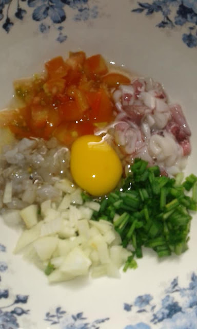 ▶️ Cincang sotong dan udang yang telah dibersihkan.